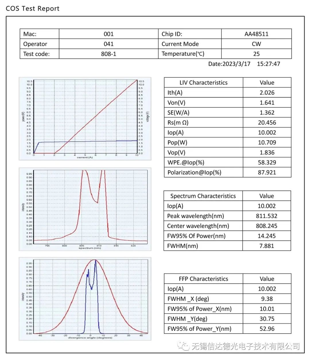 ●在脉冲电流或CW电流模式下测得LIV曲线(5S/10个电流点)、光谱特性、远场特性、偏振特性,并生成曲线图和数据报告。